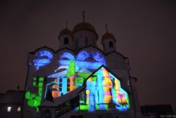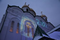 Зато все могли слышать уставной колокольный звон, который был совершен по окончании всенощного бдения. В это время на южный фасад храма проецировали церковные образы годового богослужебного круга, которые были подготовлены протоиереем Георгием Крейдуном, настоятелем Иоанно-Богословского храмового комплекса.