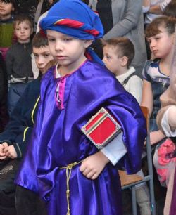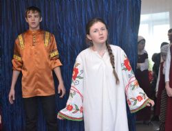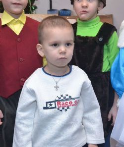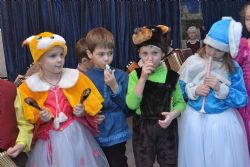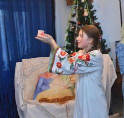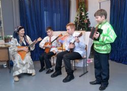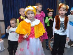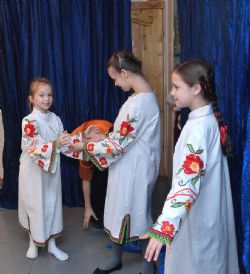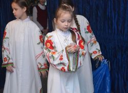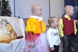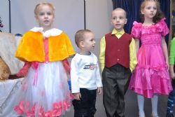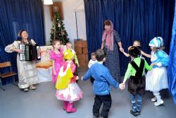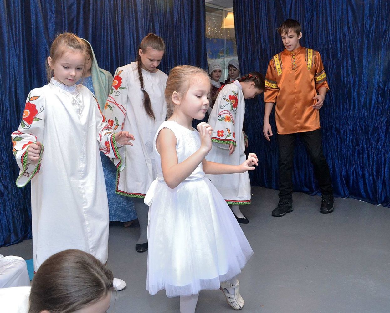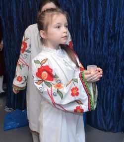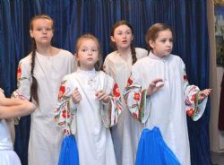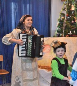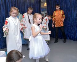 Праздничный концерт начался с театральной постановки "Дары", затем самые маленькие артисты исполнили песенку "Елочка" и выступили в составе фольклорного коллектива.
