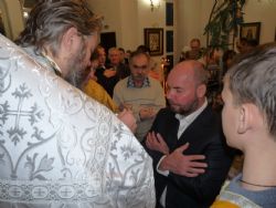 Вместе с клириком храма вмц. Варвары иереем Георгием Боговичем военный священник помазал воинов святым елеем. Затем священнослужители совершили благодарственный молебен перед походным иконостасом воинской молельной комнаты в Клубе офицеров управления.