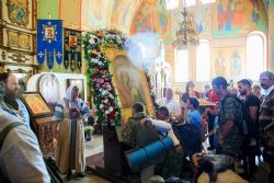 Сразу же в храме тысячи верующих приложились к чудотворному образу Богоматери, а священник окропил людей святой водой.