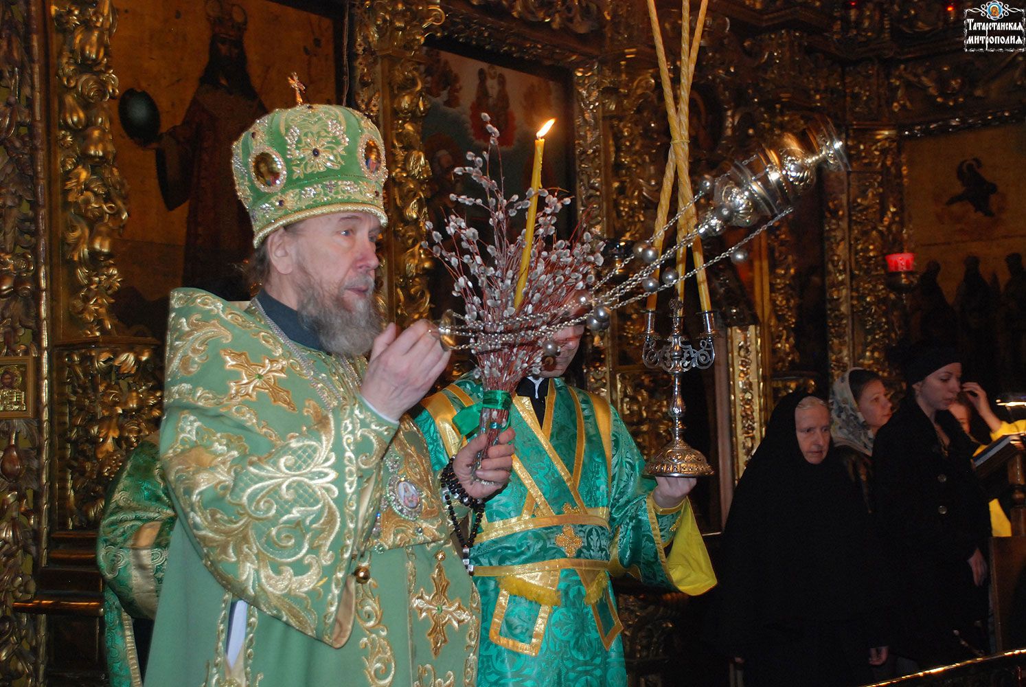 За Всенощным бдением преосвященный Владыка совершил освящение ветвей верб, которые по традиции окропляют в этот день в память о Евангельских событиях, произошедших при входе Спасителя в Иерусалим. Верба приносится в храм вместо пальмы, потому что она первая из всех растений успевает распустить почки к этому времени.