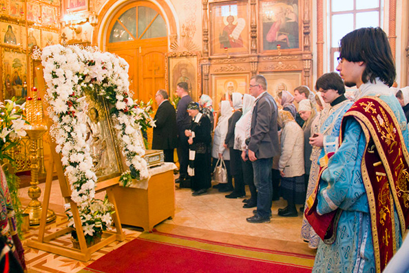 После сугубой ектении была прочитана молитва о мире на Украине. По окончании богослужения перед чтимой иконой было совершено молебное пение. Затем владыка Мефодий обратился к гостю со словами приветствия, после чего преподнес ему памятный подарок. В ответном слове епископ Алексий поблагодарил управляющего Альметьевской епархией за приглашение и совместную молитву.