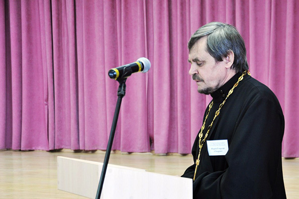 Затем с приветственным словом к участникам конференции обратился кандидат педагогических наук, клирик Свято-Вознесенского архиерейского подворья иерей Георгий Опарин. Он отметил, что духовно-нравственное воспитание детей и молодёжи невозможно без религиозного фундамента, поэтому необходимо ввести в школах предмет «Основы религиозных культур и светской этики». Кроме того, священник сказал, что в воспитании важную роль играет семья, на которую сегодня ополчились силы зла. Семьи неполные, неверующие, а из-за потребительского отношения к жизни очень мало многодетных семей. Для молодых семей очень важны комфорт и материальное благополучие. Также отец Георгий высказался по проблеме ювенальной юстиции, которую предлагается ввести в России. Он, в частности, сообщил, что в Европе только за небольшой промежуток времени из семей изъято более миллиона детей. В завершение своего выступления священнослужитель поблагодарил собравшихся педагогов за обозначение проблемы и желание работать в этом направлении.