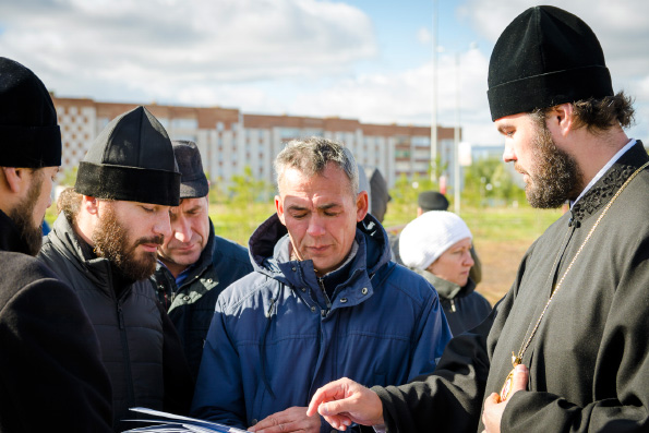 По окончании богослужения в сопровождении руководителя Исполнительного комитета Азнакаевского муниципального района Айдара Шамсутдинова и заместителя начальника управления по экономике НГДУ «Азнакаевскнефть» Владимира Попова, владыка ознакомился с ходом работ по строительству храма в честь святых мучениц Веры, Надежды, Любови и матери их Софии.