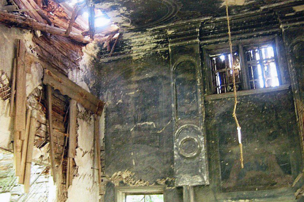 Время и люди нанесли в храм много земли (и мусора). Мы находимся на определённом уровне над полом. В алтаре я пытаюсь отыскать дымоход для кадила (что может ещё искать бывший пономарь) и сначала не обнаруживаю его, но потом вижу — продолговатая ниша находится у самой земли. Повсюду проросли деревья и валяются какие-то жернова (видимо, здесь была мельница). На Горнем месте — углубление для иконы с заржавевшим гвоздём. С потолка свисает чёрная паникадильная цепь. Полустёртые иконы смотрят на нас со стен.