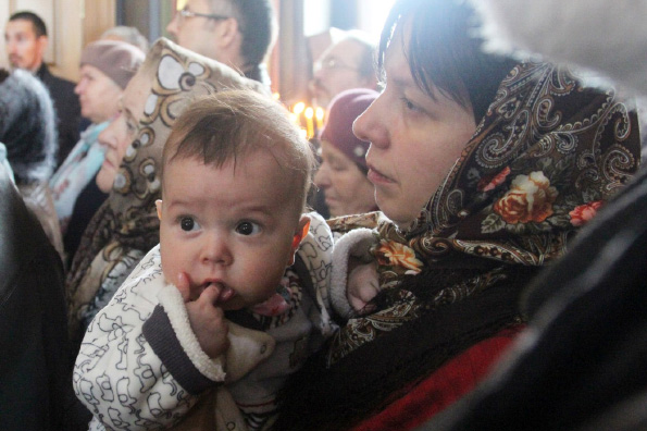 Обращаю внимание на то, что многие прихожане держат на руках малышей. Думаю, слава Богу: деток рожают, ведут к Чаше. Малыши всегда трогательны: носики-курносики, чистые глаза, губки бантиком. Одна девочка сопела на плече папы, обнимая широкую спину ручонками. Смотрю на эту сценку и благоговею, как перед иконой. Сама Жизнь свидетельствует о себе детскими личиками, солнечными зайчиками выглядывающими из-под родительского плеча.