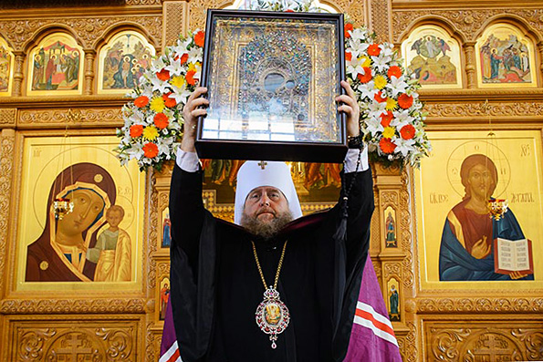 Под пение тропаря «Заступнице усердная» иерархи внесли чудотворный образ под своды собора и установили киот в центре храма, после чего началось совершение молебна.