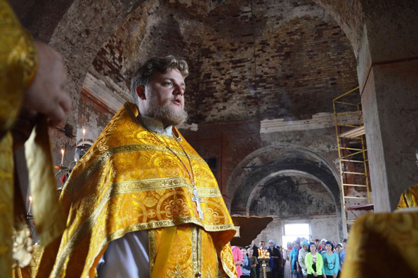 Служение Божественной литургии в престольный праздник возглавил клирик Свято-Вознесенского архиерейского подворья иерей Александр Ворошилов. Перед началом службы священник исповедовал детей, воспитанников клуба юных спасателей «Спас» и многочисленных взрослых, пришедших на престольный праздник. Во время исповеди на клиросе был прочитан акафист святым апостолам.