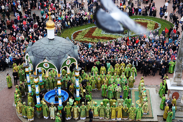 По окончании молебна Святейший Патриарх Кирилл с балкона Патриарших покоев обратился к участникам торжеств — архиереям, духовенству, монашествующим и мирянам — с Первосвятительским словом.