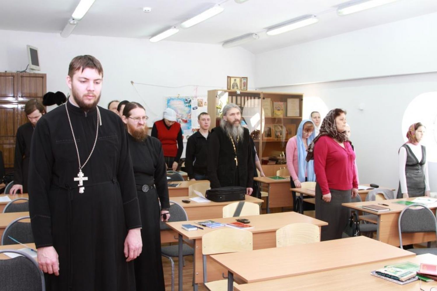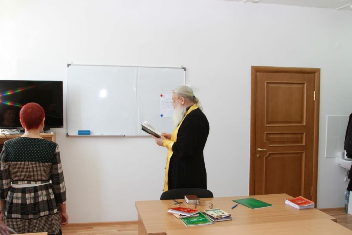 Первое занятие предварил молебен на начало всякого доброго дела, который совершил руководитель Отдела религиозного образования и катехизации протоиерей Вячеслав Ершов. В своем слове батюшка отметил насущную необходимость совершения богослужений и произнесения проповедей и бесед на национальном языке республики. По словам священнослужителя еще покойный Святейший Патриарх Алексий II в далеком 1993 году при образовании нашей епархии благословил ведение проповеди на марийском языке. Спустя 21 год благословение Патриарха получило новую жизнь: 28 священнослужителей и 10 мирян приступили к нелегкому делу – изучению языка. Преподавать на курсах приглашены доценты кафедры марийского языка МарГУ Барцева Л.И. и Матросова Л.С., а также руководитель комиссии по переводу Священного Писания иерей Николай Чузаев.