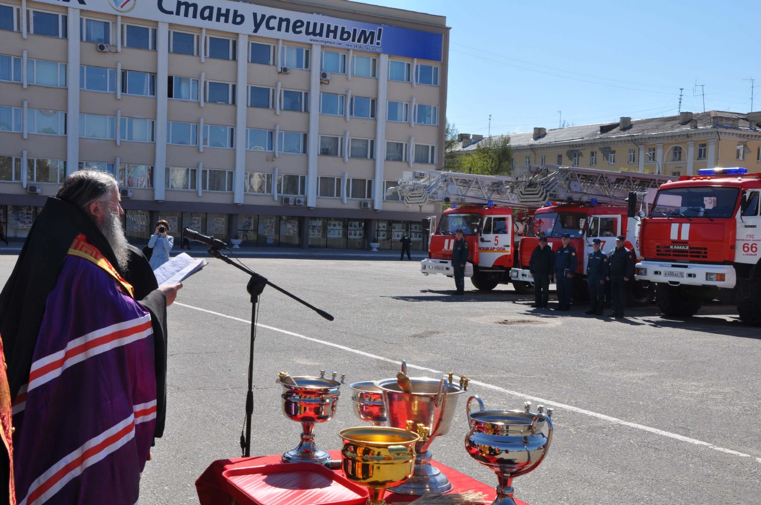 7 мая на площади Ленина города Йошкар-Олы архиепископ Йошкар-Олинский и Марийский Иоанн с клириками епархии совершили освящение автомобилей спасательного ведомства.