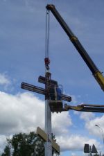 Первым рейсом была доставлена нижняя часть креста. Пока ждали верхнюю, с помощью трехосного подъемного автокрана, арендованного в ОАО «Управление механизации строительства», ее закрепили на бетонном основании. А затем с помощью того же крана и автовышки городского индивидуального предпринимателя В.В. Наумова смонтировали и верхнюю часть. Смонтированный Поклонный крест представляет собой металлическую конструкцию высотой 7 метров, покрытую листовым крашеным алюминиевым композитом.