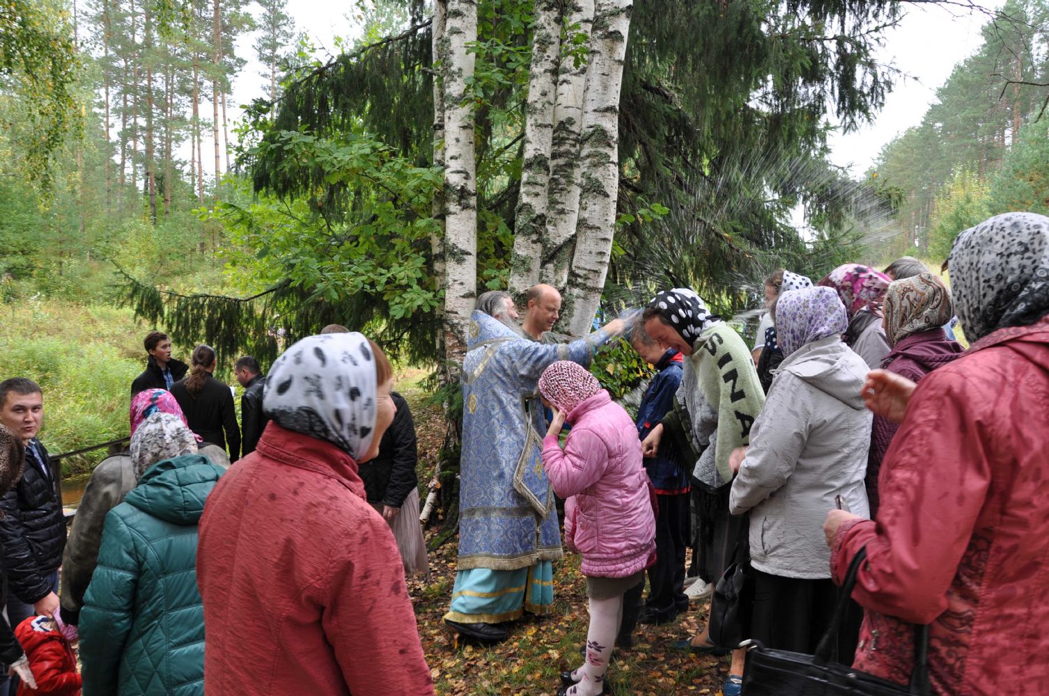 После Божественной литургии священнослужители и паломники отправились крестным ходом вокруг храма. Совершив малое освящение воды в реке Студенке, Владыка всех обильно окропил святой водой.