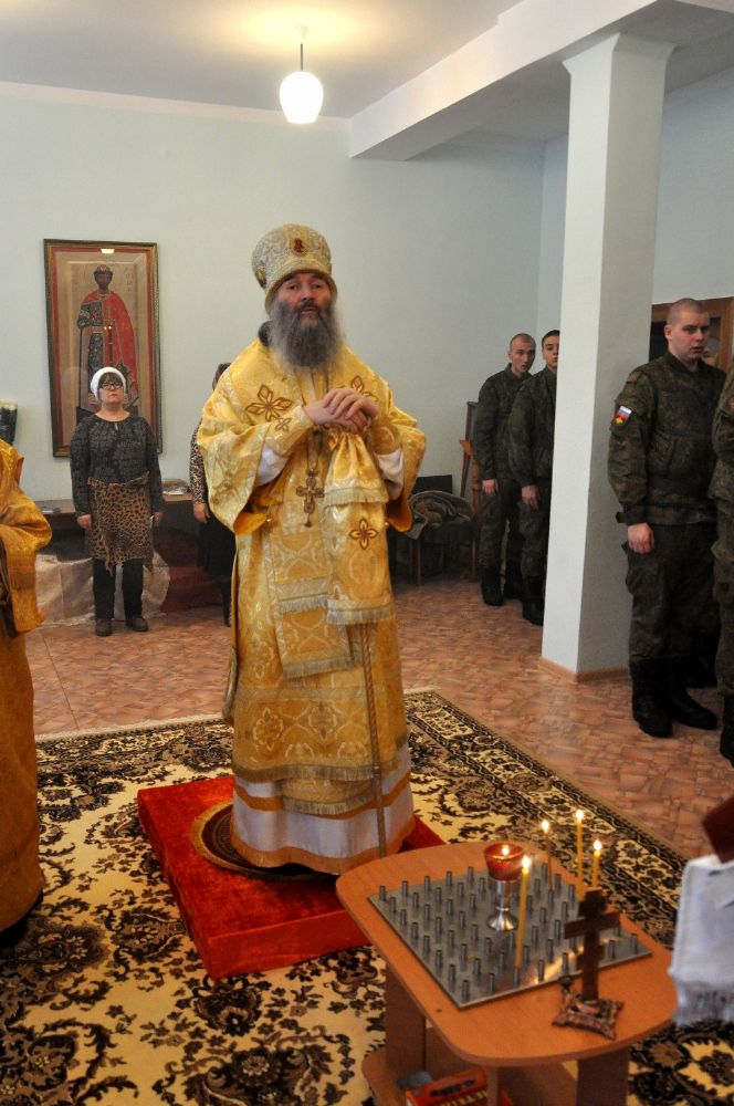 Владыке сослужил: руководитель отдела по взаимодействию с правоохранительными органами и вооруженными силами, настоятель храма святого преподобного Серафима Саровского г. Йошкар-Олы протоиерей Александр Бачурин и духовник воинской части, помощник командира дивизии по работе с военнослужащими иерей Георгий Колотов.