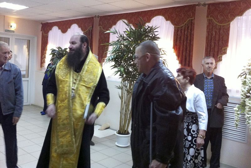 Для совершения Таинств верующие люди подходили в просторную столовую дома-интерната. Тяжело больных, прикованных к кровати, батюшки навестили в их комнатах.