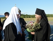 В аэропорту Соловков Предстоятеля Русской Православной Церкви встречали министр регионального развития РФ И.Н. Слюняев, губернатор Архангельской области И.А. Орлов, наместник Спасо-Преображенского Соловецкого ставропигиального монастыря архимандрит Порфирий (Шутов), глава муниципального образования «Соловецкое» Е.В. Амброче.