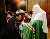 Его Святейшеству сослужили: митрополит Истринский Арсений, первый викарий Патриарха Московского и всея Руси по г. Москве; архиепископ Егорьевский Марк, председатель Финансово-хозяйственного управления Московского Патриархата; епископ Дмитровский Феофилакт, наместник Андреевского ставропигиального монастыря; епископ Солнечногорский Сергий, руководитель Административного секретариата Московской Патриархии; епископ Подольский Тихон; епископ Воскресенский Савва, первый заместитель управляющего делами Московской Патриархии, наместник Новоспасского ставропигиального монастыря.