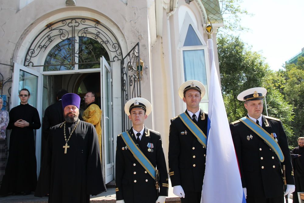 Митрополит Вениамин отслужил молебен. Его Высокопреосвященству сослужили руководитель епархиального отдела по взаимодействию с Вооруженными Силами РФ протоиерей Виктор Жильцов, настоятель Андреевского храма, помощник командующего ТОФ по работе с верующим личным составом иерей Сергий Галанов, благочинный I округа о. Димитрий Федорин, клирики Андреевского храма.