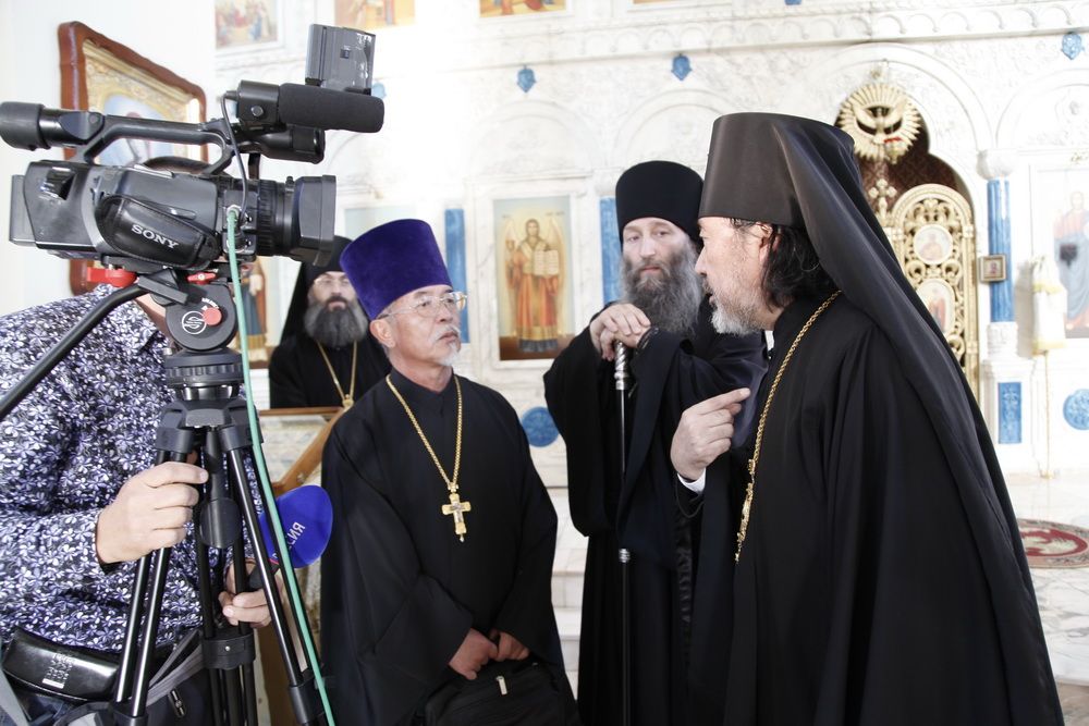 В дар владыке Серафиму владыка Гурий преподнес кустик неопалимой купины, привезенный со святой горы Синай, и казачью плётку, а о.Давид – монашеский куколь в древнерусском стиле и икону святителя Николая Чудотворца.