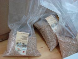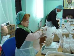 В этот раз на одну порцию фасовали по 500 г. крупы «Артек» и 30 граммов изюма. В каждый большой пакет укладывали по 4 порционных. Мы всё взвешиваем, порционные пакеты запаиваем.
