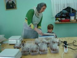 Мы собираемся для фасовки два раза в месяц. Сегодня по разным причинам к началу фасовки собрались далеко не все, кто собирался. Вот-вот будут беженцы из Украины. Они нам тоже помогают фасовать «Народные обеды» и сами являются адресатами нашей, в том числе и продовольственной, помощи. Помогать фасовать приходят и многодетные семьи.