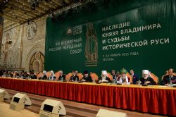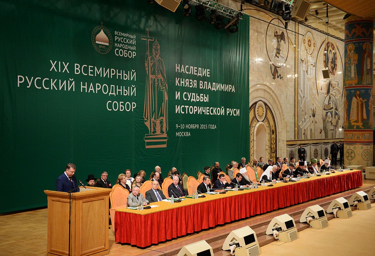 Москва. 10 ноября 2015 года в Зале церковных Соборов Храма Христа Спасителя открылся XIX Всемирный Русский Народный Собор. Тема этого года – «Наследие князя Владимира и судьбы исторической Руси». Мероприятие возглавил Святейший Патриарх Московский и всея Руси Кирилл – глава ВРНС.
