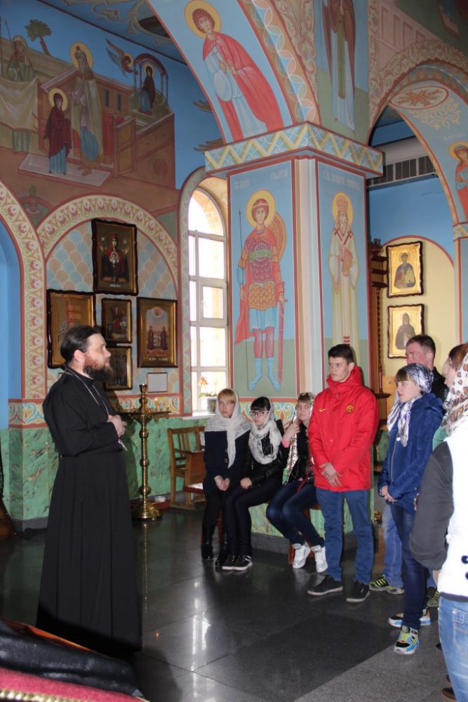 Сотрудники храма рассказали о храмовом комплексе, куда входит не только здание церкви, но и Воскресная школа, отдел по молодёжной и социальной работе, Свято-Крестовая архитектурно-мемориальная композиция, часовня для совершения Таинства Крещения с полным погружением, иконная лавка. Иерей Иоанн Караман рассказал молодёжи о внутреннем устройстве храма, почитаемых иконах, святых, Голгофском кресте, Таинствах церкви, смысле жизни.