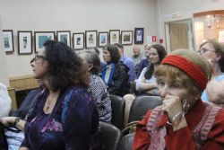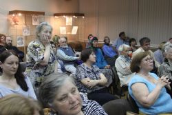 Большой зал библиотеки заполнили читатели и гости библиотеки, священнослужители, прихожане храмов. Встреча началась с небольшой презентации об основных вехах строительства Спасо-Преображенского кафедрального собора.