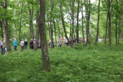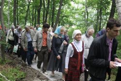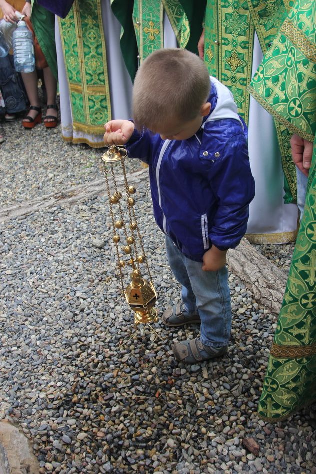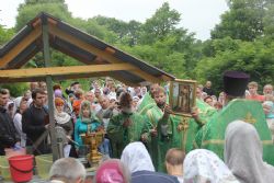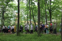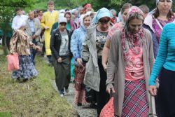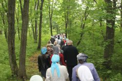 После литургии состоялся крестный ход к источнику, освященному в честь святого Тихона Калужского. Всю дорожку от храма до источника, которая проходит в лесу – это 200 метров, для удобства паломников отсыпали мелким светлым гравием – так что теперь заблудиться невозможно.