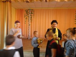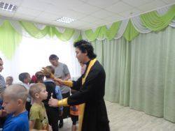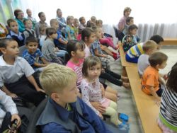 После выгрузки подарков в каждом детском учреждении в актовом зале отец Андрей отслужил молебен на начало учебного года. Молебны по традициям Православной Церкви совершаются в начале каждого учебного года. У детей из детских учреждений, которые поступили сюда в основном из неблагополучных семей, понятия о традициях весьма своеобразное. И такие малые встречи с Церковью может быть хотя бы некоторым из них послужат на пользу.