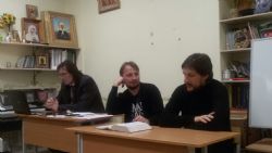 Владивосток. На собрании молодёжного отдела Владивостокской епархии были интересные гости: - о. Виктор Горбач, руководитель Отдела по работе с молодёжью Южно-Сахалинской и Курильской епархии. Батюшка очень подробно рассказал о жизни молодёжи (практически наших соседей), и той работе, которую они ведут: летних лагерях и зимних Форумах, акциях Рождества, Пасхи, Крещения Руси и т.п. Ещё один гость: Андрей Владимирович Поповкин, заведующий кафедрой философии ДВО РАН, Он рассказал о науке, философии и пригласил молодёжь поучаствовать в этнографическом диктанте, что они и сделали. Обсудили установку титанов в р/ц "Парусе надежды" и план предстоящей недели.