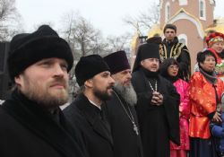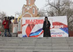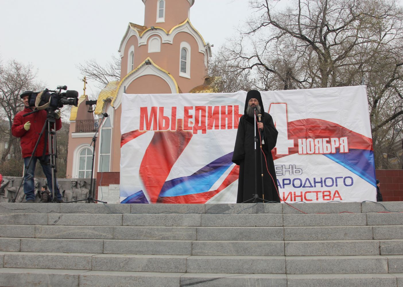 Владыка Иннокентий, обращаясь к участникам праздничного митинга, поздравил приморцев с праздником Казанской иконы Божией Матери и, в частности, отметил духовное и государственное значение празднования Дня народного единства: