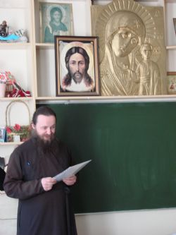 После краткого молебна перед началом олимпиады с напутственным словом к участникам обратился игумен Никита (Зеленюк), преподаватель Духовного центра подготовки церковных специалистов Владивостокской епархии, аспирант Общецерковной аспирантуры и докторантуры им. свв. равноап. Кирилла и Мефодия.