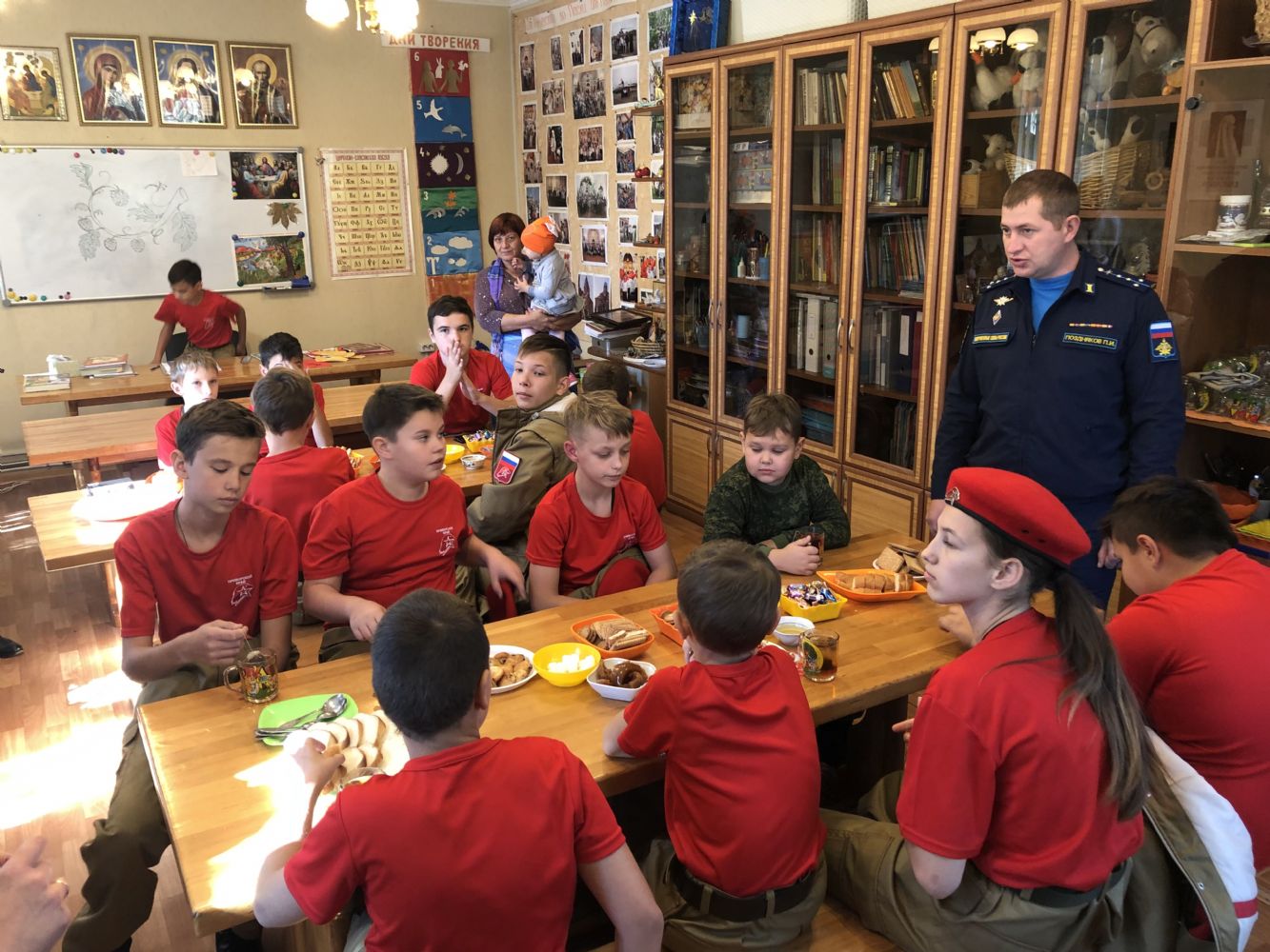 После этого настоятель храма провел детей на колокольню, где они позвонили в колокола. Рассказал им историю храма Покрова Пресвятой Богородицы. А в завершение экскурсии пригласил их на чаепитие со сладостями.