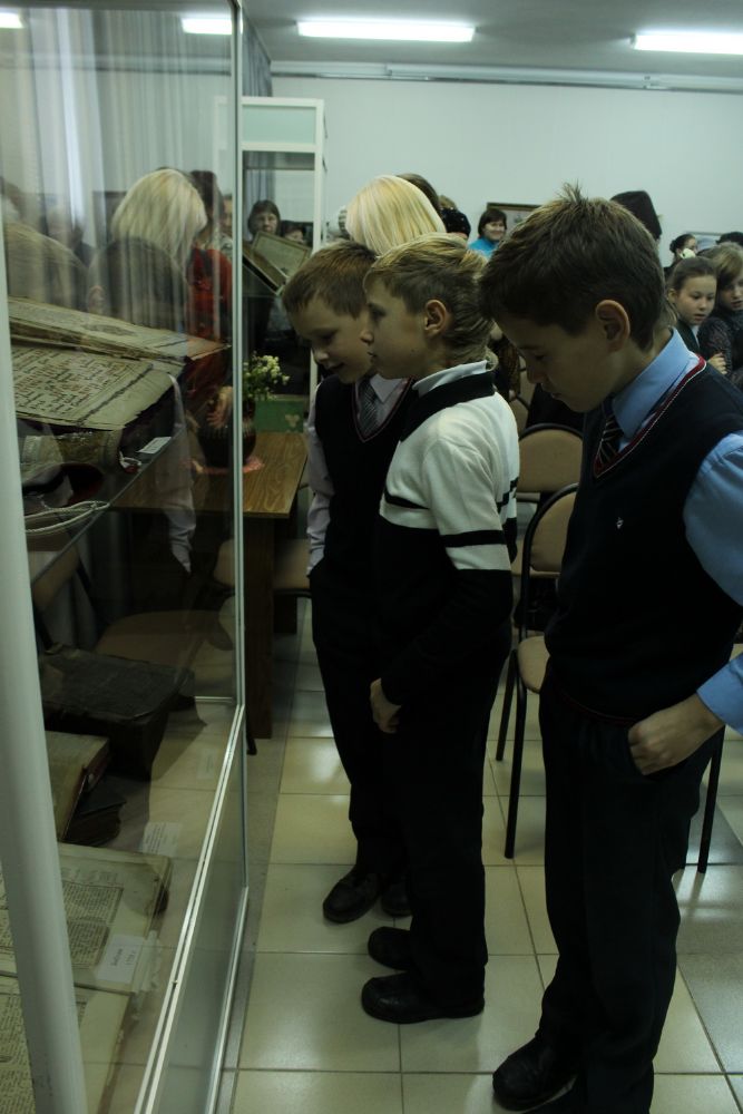 Экскурсию для учащихся гимназии №3, пенсионеров из «Университета третьего возраста» и сотрудников центральной библиотеки провела методист Рубцовского благочиния Е.В. Бычкова. Она рассказала, что экскурсанты могут увидеть здесь старопечатные книги, в частности, Напрестольное Евангелие 1786 года и Библию 1758 года, церковную утварь и многое другое.