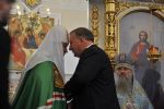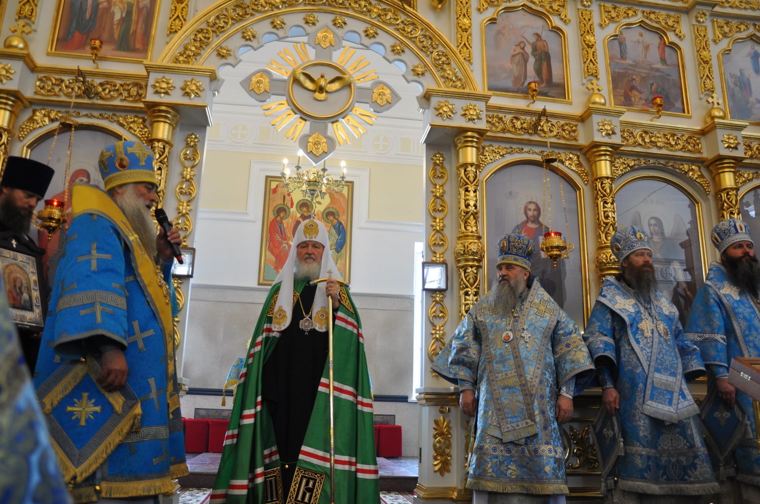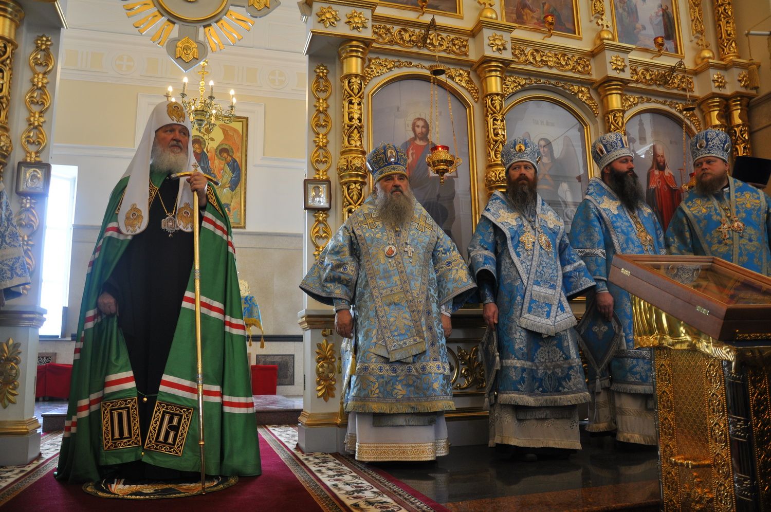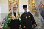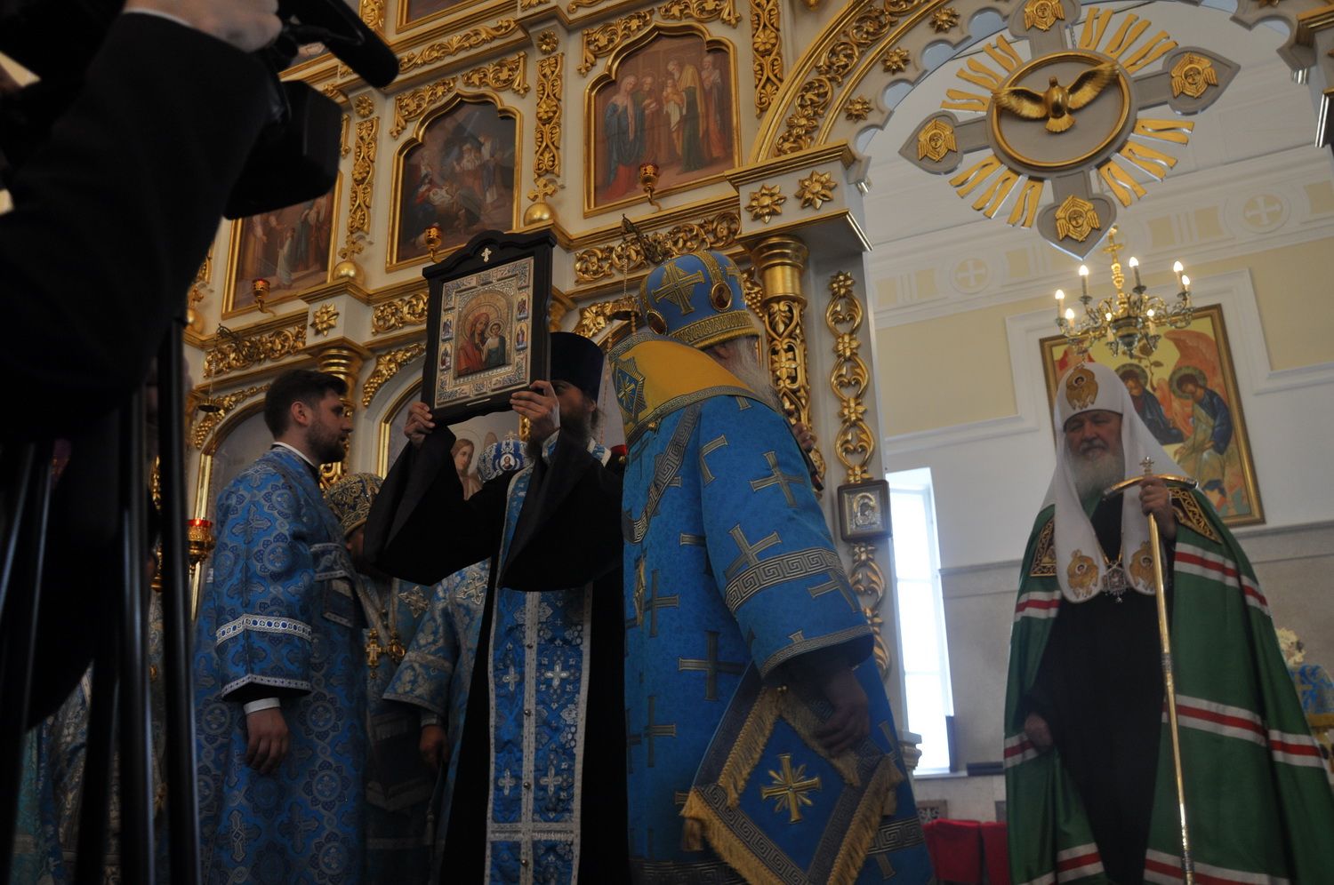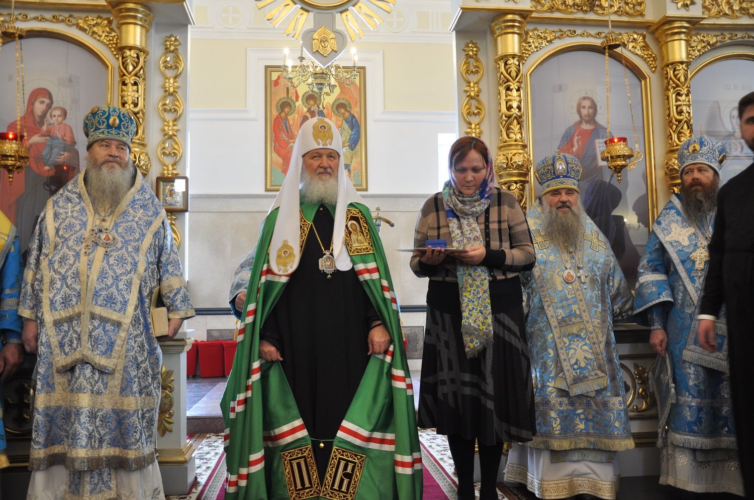 По завершении Литургии Святейшего Патриарха Кирилла приветствовал митрополит Барнаульский и Алтайский Сергий. В дар Его Святейшеству правящий архиерей преподнес список с главной святыни Алтая – чудотворной Коробейниковской-Казанской иконы Божией Матери.