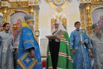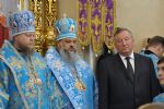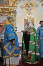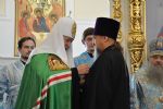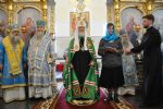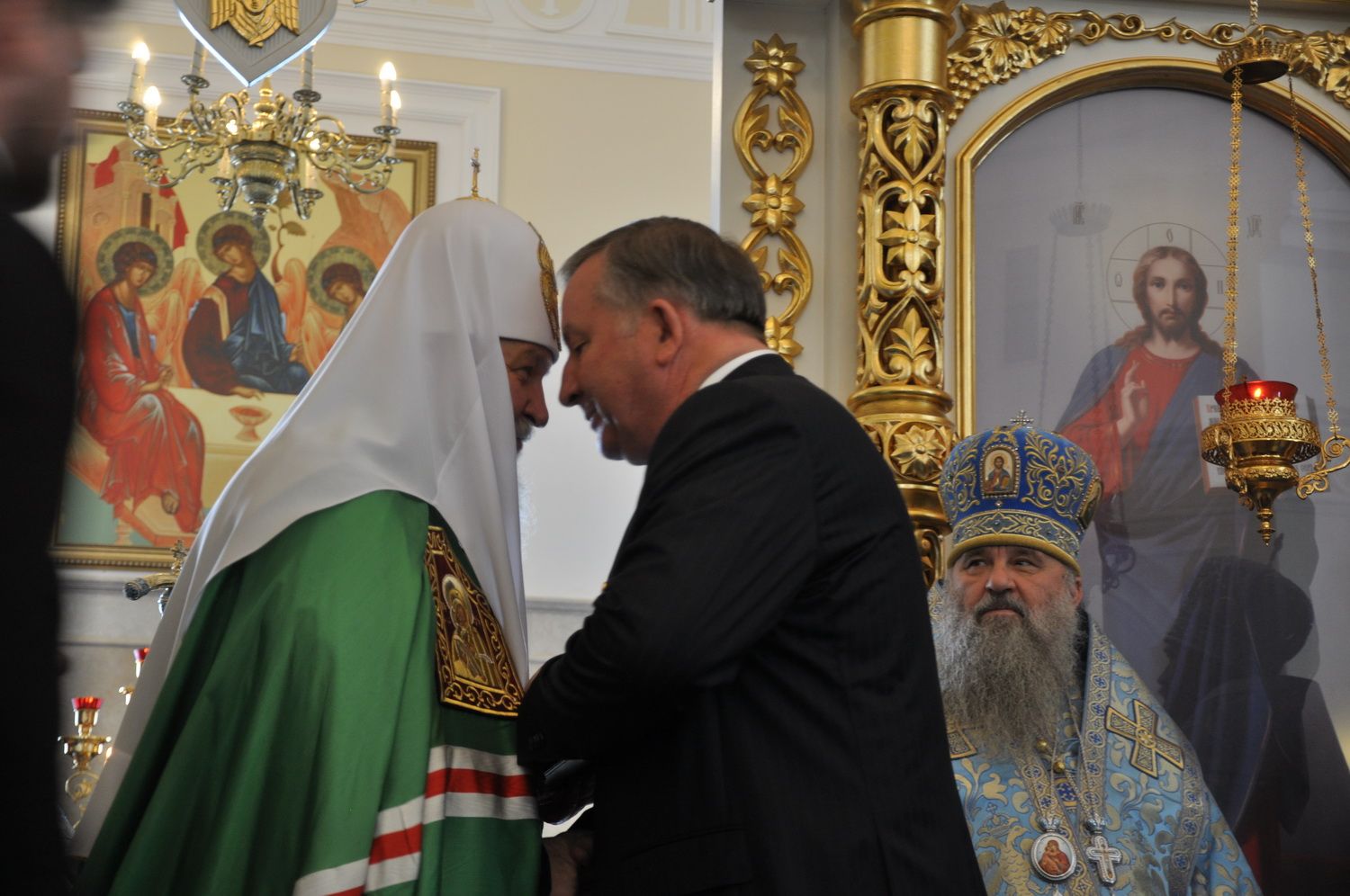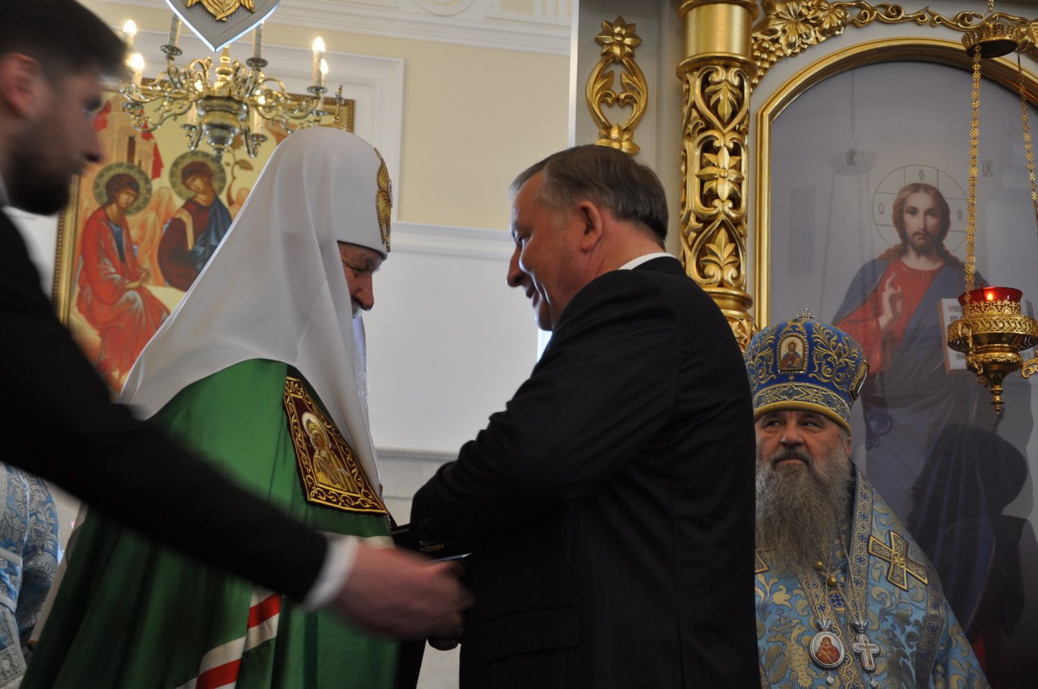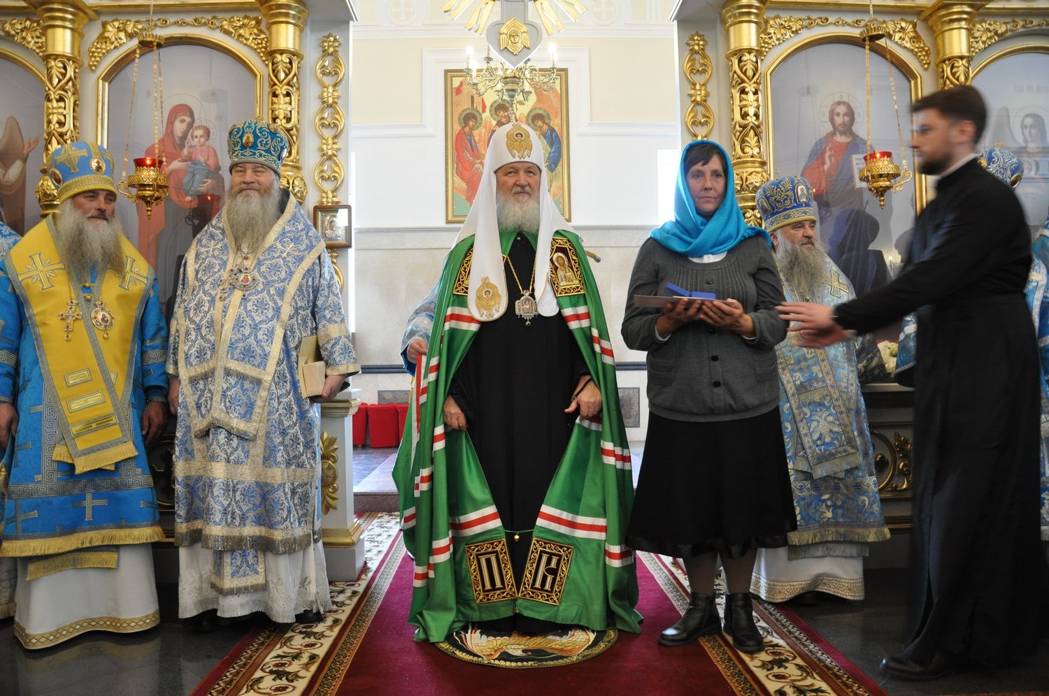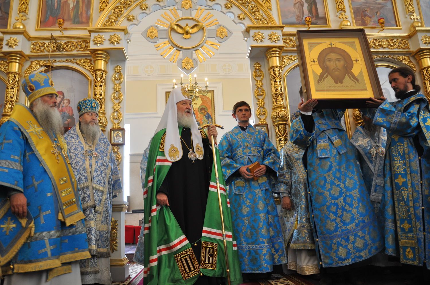По завершении Литургии Святейшего Патриарха Кирилла приветствовал митрополит Барнаульский и Алтайский Сергий. В дар Его Святейшеству правящий архиерей преподнес список с главной святыни Алтая – чудотворной Коробейниковской-Казанской иконы Божией Матери.