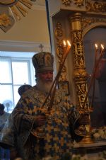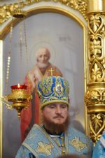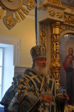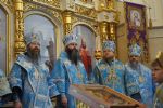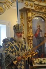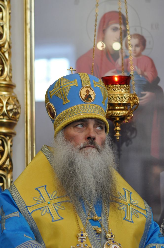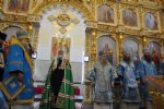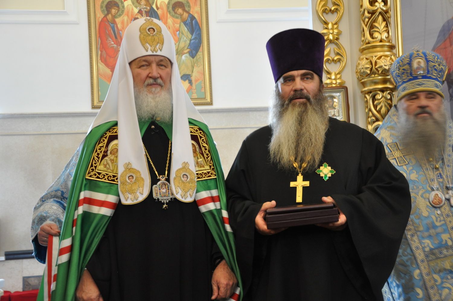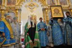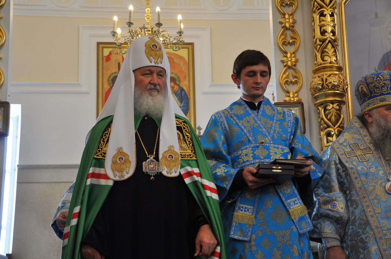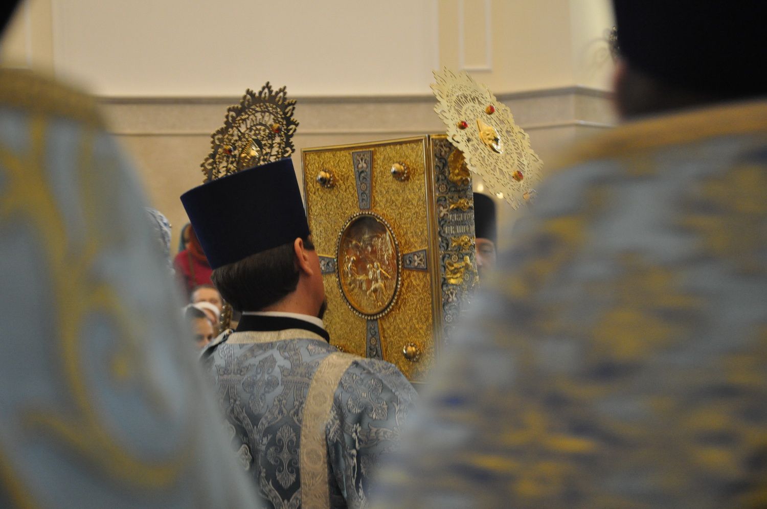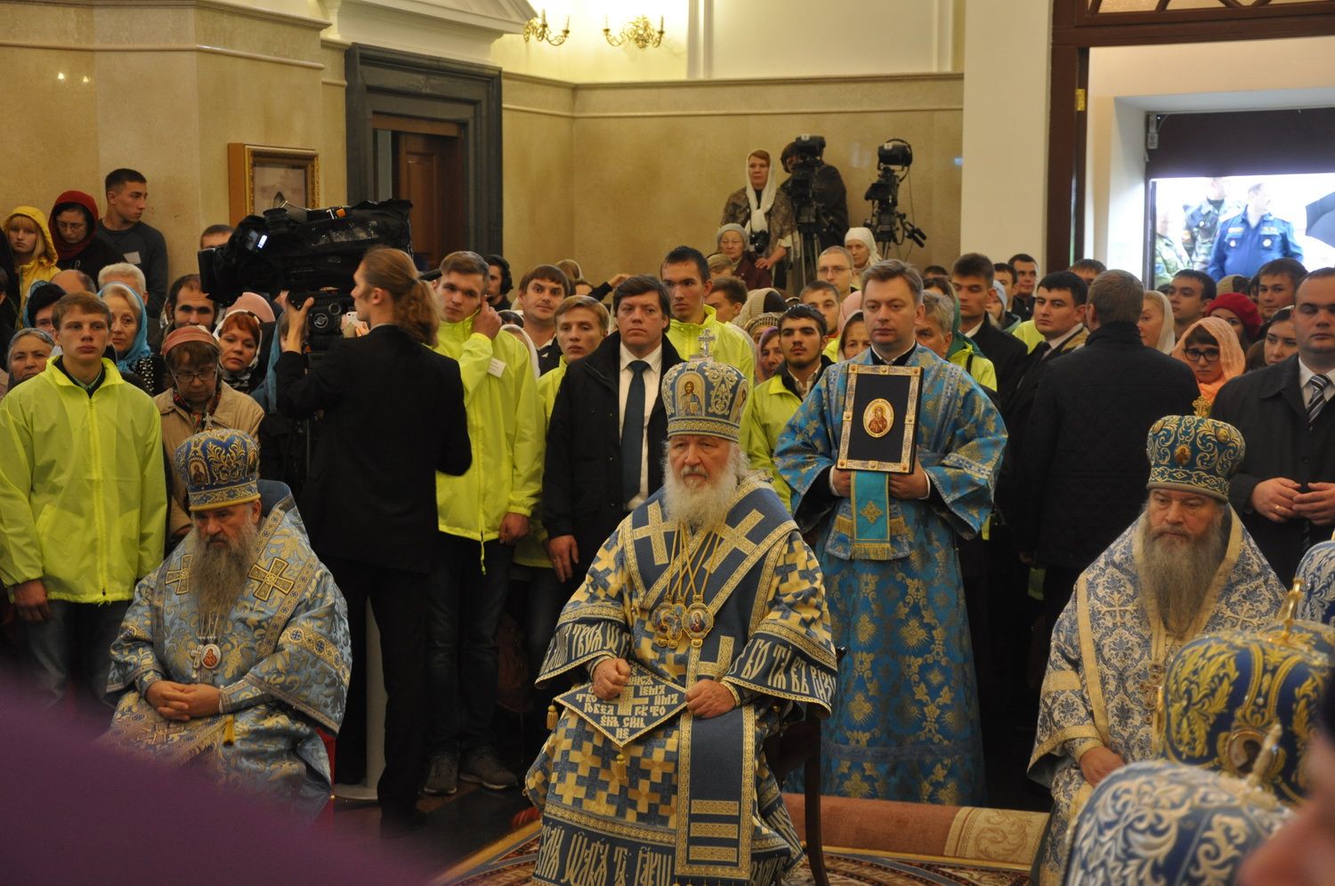 По завершении Литургии Святейшего Патриарха Кирилла приветствовал митрополит Барнаульский и Алтайский Сергий. В дар Его Святейшеству правящий архиерей преподнес список с главной святыни Алтая – чудотворной Коробейниковской-Казанской иконы Божией Матери.