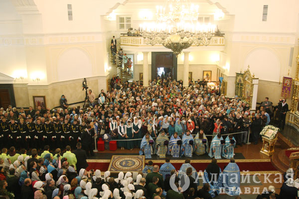 Барнаул стал конечным пунктом рабочей поездки патриарха. Накануне он побывал в Республике Алтай, где провел официальные мероприятия. На торжественном богослужении на главной площади республиканской столицы вместе с патриархом Кириллом молились около пяти тысяч человек.