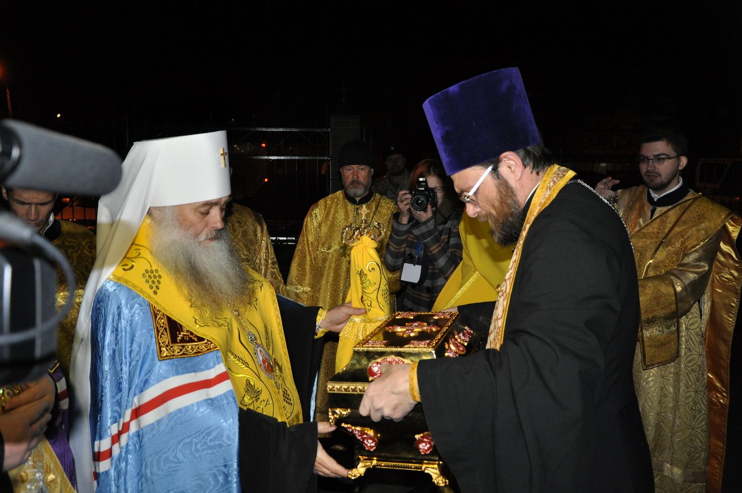 Святыню встречали митрополит Барнаульский и Алтайский Сергий, епископ Рубцовский и Алейский Роман, епископ Бийский и Белокурихинский Серапион, епископ Славгородский и Каменский Всеволод и сонм духовенства Алтайской митрополии. После того как ковчег внесли в храм, священнослужители совершили молебен в честь святого равноапостольного князя Владимира, по завершении которого всем роздали небольшие иконы Крестителя Руси.