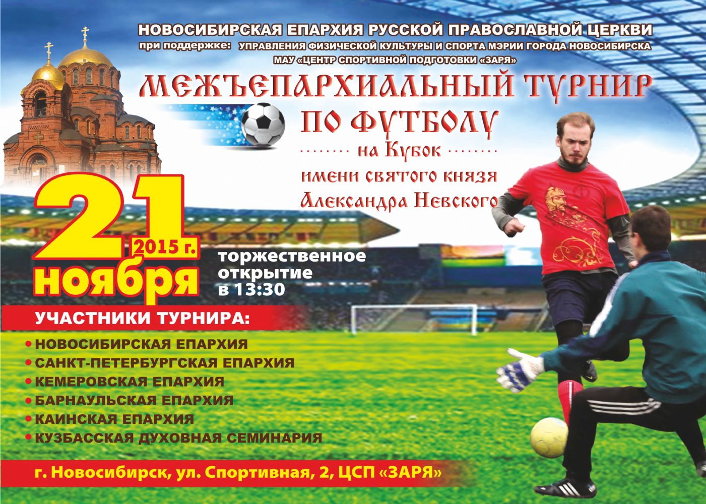 Межъепархиальный турнир по футболу на Кубок имени святого благоверного князя Александра Невского пройдет впервые в грядущую субботу 21 ноября в Новосибирске. Об участии в спортивном мероприятии уже заявили шесть епархий. Соревнование организуется по благословению митрополита Новосибирского и Бердского Тихона с целью пропаганды здорового образа жизни, духовно-нравственного воспитания молодежи.