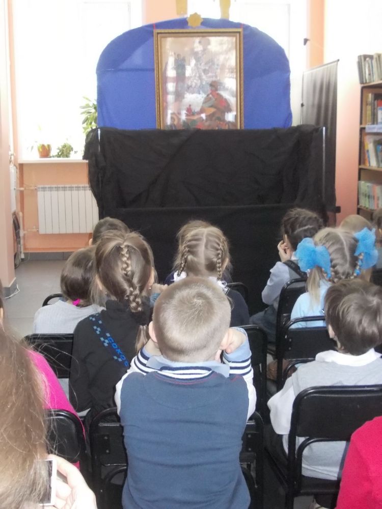 Юные зрители собрались в городской библиотеке №18. Сначала сотрудники библиотеки рассказали им об истории и традициях празднования Нового года и Рождества Христова. А на вопрос о том, откуда в России появилась традиция ставить в домах елки, ответили сами ребятишки. Потом им показали кукольное представление (рождественский вертеп) о празднике Рождества Христова под аккомпанемент протодиакона Владимира Черных, а воспитанницы подготовительного отделения Регентской школы спели несколько колядок.
