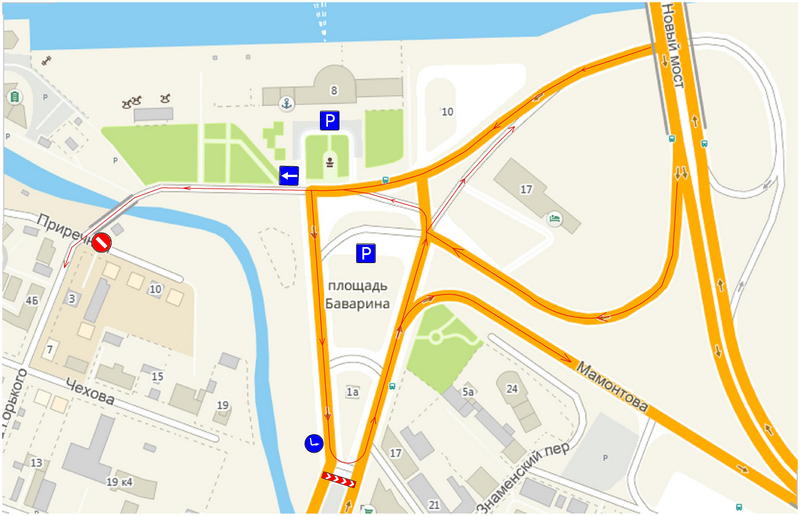 Так, по временной схеме движения заезд на пл. Баварина будет осуществляться со съездов с Нового моста, выезд с пл. Баварина будет организован на улицы Мамонтова и Максима Горького.