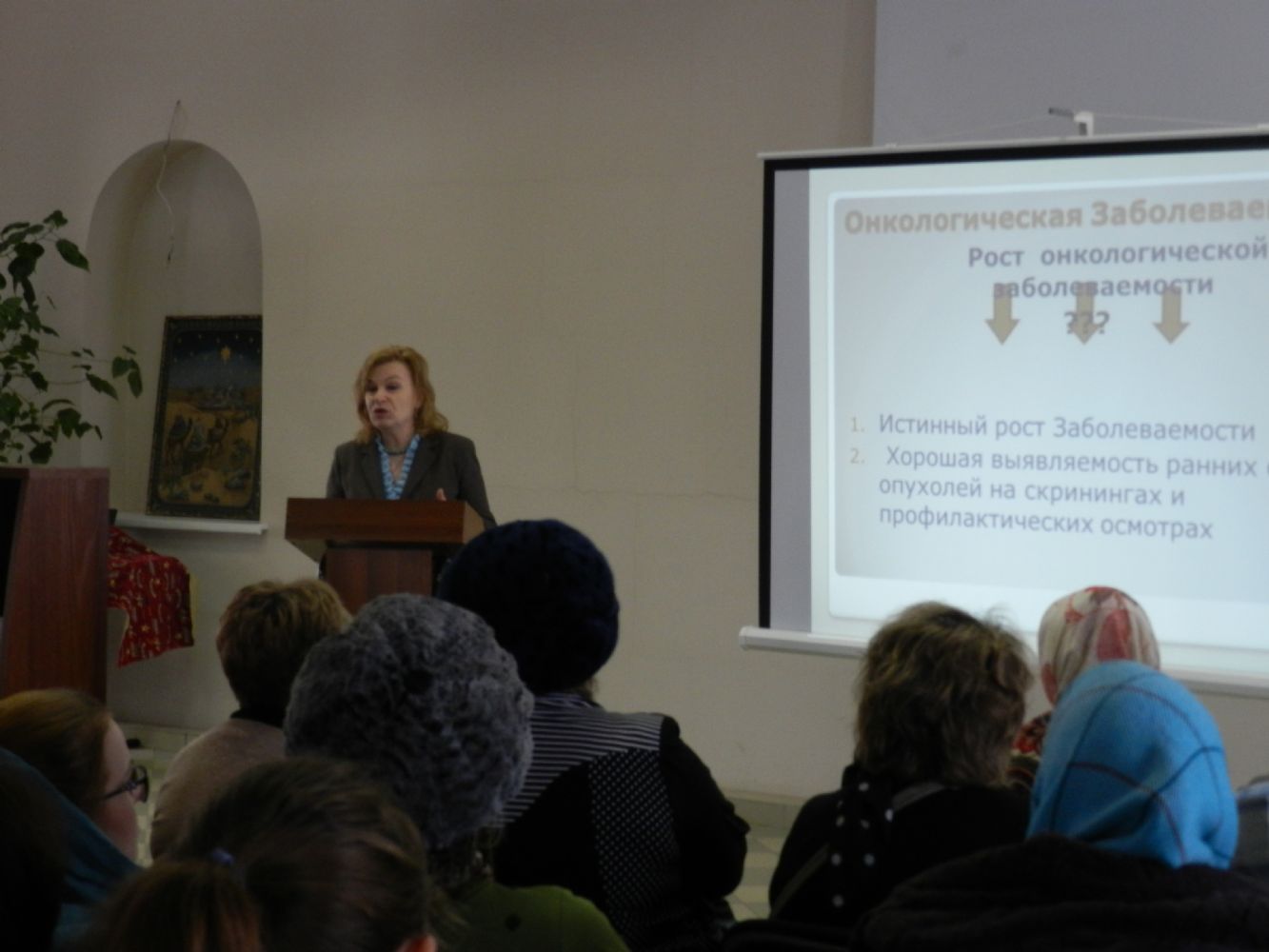 Первой выступила заместитель главного врача Алтайского краевого онкологического диспансера по диспансерному учету, врач высшей категории, к.м.н. Валентина Дмитриевна Петрова. Ее доклад, одновременно доступный в изложении и отражающий глубокий научный опыт осмысления проблемы профилактики злокачественных новообразований, был выслушан с неподдельным вниманием. Главное, на что было обращено внимание, это на возможности современной алтайской медицины рано диагностировать и с высоким эффектом оказывать помощь больным со злокачественными заболеваниями разной локализации. В докладе также были выделены факторы риска возникновения злокачественных опухолей, названы основные диагностические мероприятия скринингового (массового, «отсеивающего») характера. Презентацию своего сообщения Валентина Дмитриевна любезно предложила вниманию читателям нашего сайта.