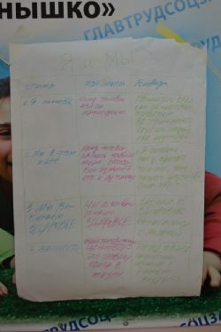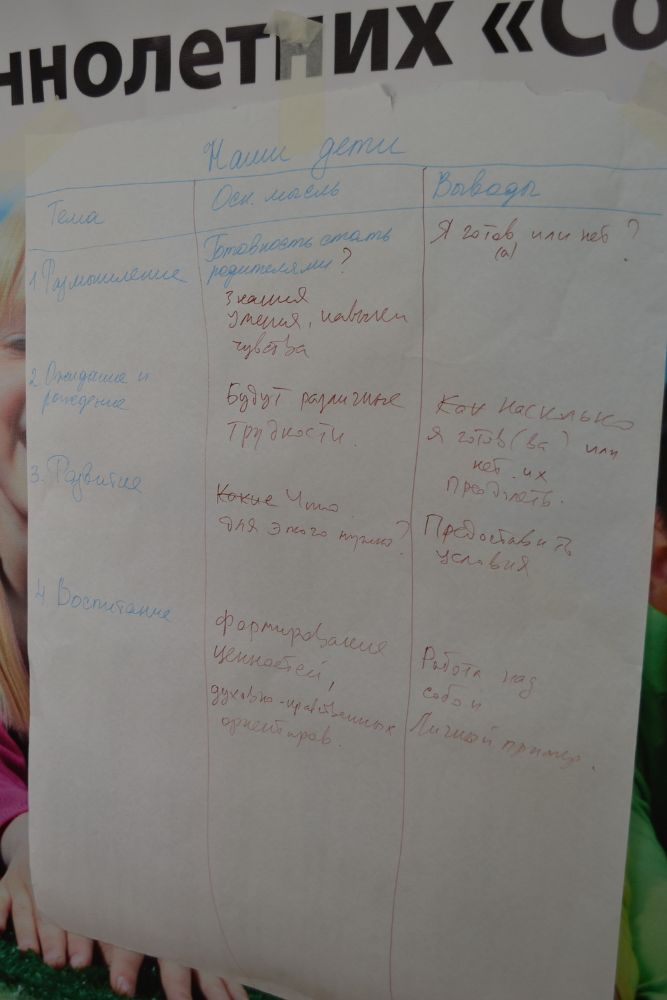 Их ведущей выступила сопредседатель «Совета жен священнослужителей имени Александры Федоровны Романовой» матушка Александра Холодкова. Она провела тренинг со специалистами, которые работают с детьми из неблагополучных семей и оказались в трудной ситуации. После она побеседовала с психологами. Те, в свою очередь, поделились своим опытом и результатами работы.