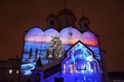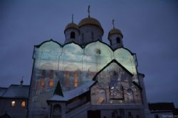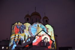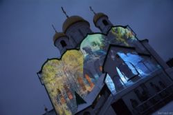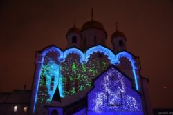 Зато все могли слышать уставной колокольный звон, который был совершен по окончании всенощного бдения. В это время на южный фасад храма проецировали церковные образы годового богослужебного круга, которые были подготовлены протоиереем Георгием Крейдуном, настоятелем Иоанно-Богословского храмового комплекса.