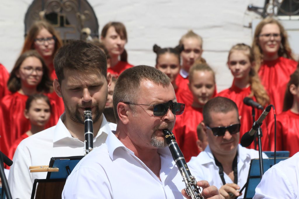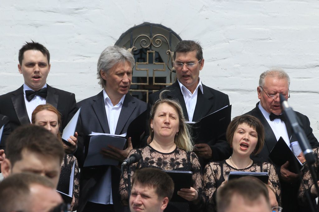 Под открытым небом выступили барнаульский сводный детский хор и хор «Сентябринки», городской академический хор им. Тарнецкого, Барнаульский духовой оркестр, сводный хор барнаульских храмов, коллективы краевой филармонии – симфонический оркестр под управлением дирижера Дмитрия Лузина, мужской вокальный ансамбль и ансамбль народной песни «Вечерки», а также юные и взрослые солисты. День 24 мая выдался солнечным, но коварный ветер то и дело угонял у музыкантов ноты и «подпевал» в микрофоны.