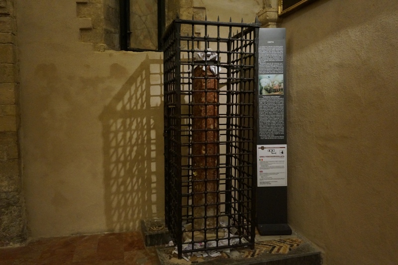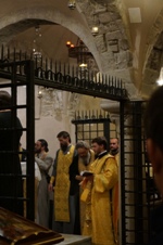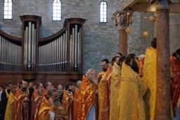 По прибытии в г. Бари 20 мая в крипте базилики, где покоятся честные мощи святителя Николая, Мир Ликийских чудотворца, был совершен молебен с акафистом святителю. Базилика была построена в XI веке для пребывания в ней мощей свт. Николая после их перенесения в 1087 году из Мир Ликийских в Бари. В базилике находится мраморная колонна, которая чудесным образом приплыла из Мир Ликийских в Бари вслед за мощами Чудотворца. Паломники имели возможность приложиться к мощам святого.