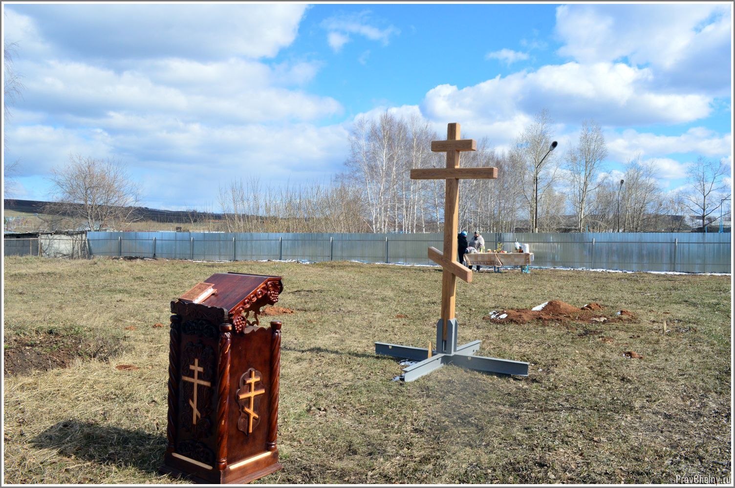 По окончании Божественной литургии священнослужители в сопровождении прихожан храма вышли крестным ходом на место строительства храма. Суббота Светлой Седмицы внесла свои коррективы в чин, и начало его озарилось многократным пением тропаря Пасхи. «Христос воскресе из мертвых, смертию смерть поправ, и сущим во гробех живот даровав», — неслось эхом по улицам села. «Христос Воскрес, — воскреснет и храм», — тихо говорили жители села во время чинопоследования молебна.