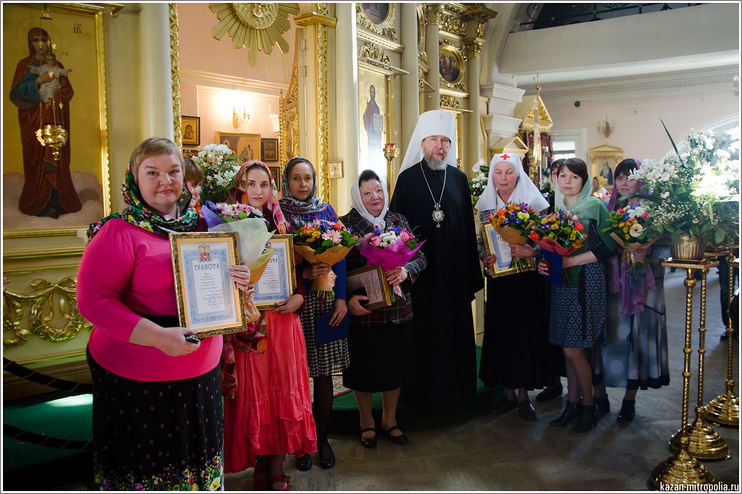 «Вы, действительно, наши избранницы, совершаете большое служение на нашей Татарстанской земле. Вы являетесь добрыми и образцовыми служительницами своего домашнего очага. Я хотел бы накануне праздника жен-мироносиц поблагодарить вас за то, что вы есть, за то, что вы несете то послушание, которое должна нести каждая женщина. Но в меру своих физических и духовных возможностей вы делаете все то, что порой невозможно сделать человеку, живущему вне пределов Церкви Христовой. Поэтому мы с благодарностью приносим Вас сегодняшние поздравления и хотим вручить наши церковные награды», — сказал Высокропреосвященнейший Владыка в своем слове.
